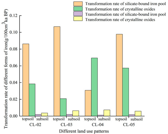 For the subsoil layer, the silicate-bound iron pool’s maximum conversion rate in CL-03 was 0.002 g/100 cm3 ka BP, with CL-04 again showing the minimum rate of 0.001 g/100 cm3 ka BP. This followed the sequence of CL-03 > CL-02 > CL-05 > CL-04. With regard to the subsoil conversion rate between crystalline oxides and poorly crystalline iron oxides, CL-04 topped the list at 0.007 g/100 cm3 ka BP, and CL-02 came in last at 0.003 g/100 cm3 ka BP, following the order CL-04 > CL-03 > CL-05 > CL-02.