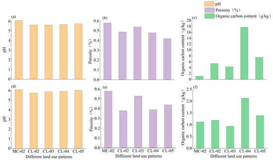 The pH, porosity, and organic carbon content of Quaternary red soils under different land use patterns. Note: (a–c) in the figure show the pH, porosity, and organic carbon content of the topsoil in Quaternary red soils under different land use patterns; (d–f) show the pH, porosity, and organic carbon content of the subsoil layer.