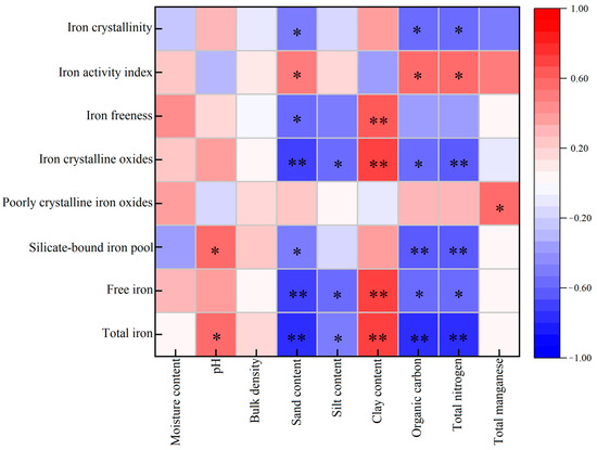The heat map of correlations between iron content, ratios of iron in different forms, and the physical and chemical properties of Quaternary red soils. Notes: “*” indicates significance at a p-value of 0.05. “**” indicates significance at a p-value of 0.01.
