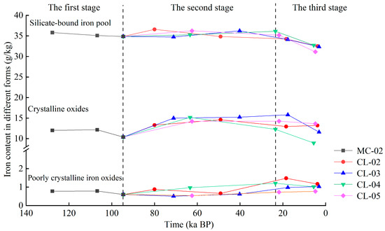 The second stage, from 94–24 ka BP, witnessed significant changes. As the soil was exposed on the surface due to erosion, it became influenced by human land use practices, leading to increased vegetation and root growth. This period incurred an influx of plant litter and fertilizer, resulting in elevated content of organic matter. Microorganisms decomposed this organic matter, releasing organic acids. These acids facilitated the weathering and reduction of iron-containing silicate minerals [55], ultimately releasing poorly crystalline iron oxides at a conversion rate ranging from 0.001 to 0.003 g/100 cm3 per ka BP. Consequently, the silicate-bound iron content decreased over time, while the poorly crystalline iron oxides increased. A portion of these newly formed oxides dissolved and moved downward, while the remainder crystallized into crystalline oxides, exhibiting an increasing trend with time at a conversion rate of 0.004 to 0.01 g/100 cm3 per ka BP.