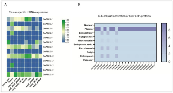 We next examined the expression pattern of GmPERK genes in different soybean tissues (Figure 1A). The GmPERK mRNA expression levels in young leaf, flower, pod (1 cm), pod shell (10 DAF, days after flowering), pod shell (14 DAF), nodule, root, seed (10 DAF), and seed (25 DAF) were retrieved from the ePlant/Soybase database. These values were then used to generate a heat map and the genes with identical expression patterns were clustered together, depicting the mRNA expression profile of 16 GmPERK genes in various tissues (Figure 1A and Table S2). GmPERK-8, 10, 16 exhibited expression in multiple plant organs, while GmPERK-6, 12, 15 showed nearly no expression in these tissues. In particular, GmPERK-16 has a greater mRNA expression level than the other GmPERK genes.