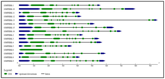 The gene structure of all GmPERK genes. The coding sequence (CDS) is shown in green; the 5′ untranslated region (5′ UTR) and 3′ untranslated region (3′ UTR) is in blue; the introns are in black.