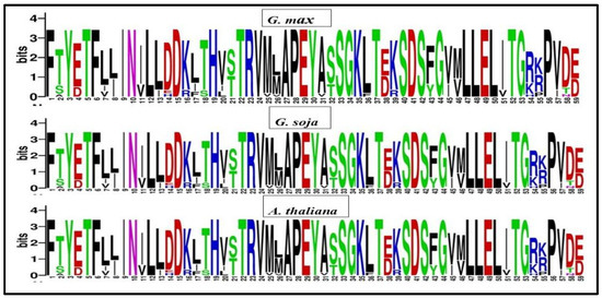 Sequence logos were generated using multiple sequence alignments from Arabidopsis thaliana, Glycine soja, and Glycine max to identify comparable domain sequences and examine the conservation of each amino acid residue within the domains of GmPERK. The results revealed no significant similarity in the amino acid residue patterns across most loci among three plant species studies. Nonetheless, we detected a very consistent region including 59 amino acids, among which F [1], T [5], F [6], N [10], L [12], D [15], D [19], T [22], R [23], A [27], P [28], E [29], L [47], L [48], E [49] were highly conserved, implicating functional significance of these residues (Figure 3). On the other hand, certain amino acids, namely TS [2], ED [4], LI [8], ED [38], MV [46], RK [54], and VI [57] were observed to have variation in their composition across different homolog genes and species (Figure 3). The identified sequence logo will help in defining new homolog genes in other species.