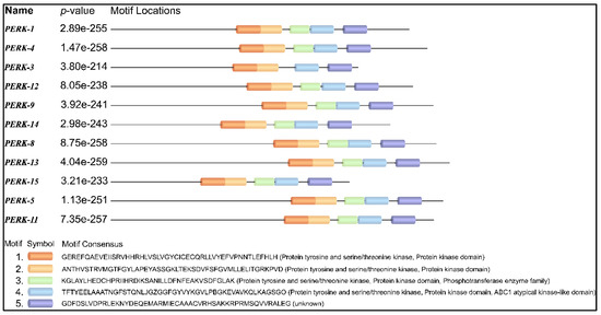 A protein motif refers to a short consensus amino acid sequence that holds a specific biological function. Motif analysis revealed that motifs often occurring in the protein tyrosine and serine/threonine kinase domain were observed in the PERK family (Figure 4). It is shown that certain motifs are not only conserved in all sequences, but are also arranged in a similar way, while the distance varies between motifs. Most members of GmPERK except GmPERK-3 carry similar motif types and arrangement. Conserved motifs are important for the proper functioning of the genes within the family. Interestingly, GmPERK-3 possesses one less motif compared to the other members of the gene family, implying it may vary in protein kinase activity.