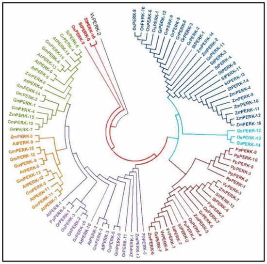 PERK genes from different plant species, including Arabidopsis thaliana, Gossypium raimondii, Solanum tuberosum (Solanaceae) and Glycine max (dicotyledon), Oryza sativa, Zea mays (monocotyledon), Physcomitrella patens (streptophyta), and Vitis vinifera (angiosperm), were investigated to examine whether a closer relationship existed between species. Hence, the phylogenetic tree was generated with mega software and protein sequences of different crops were then aligned using the mega alignment tool to create a neighbor-joining tree (Figure 5).