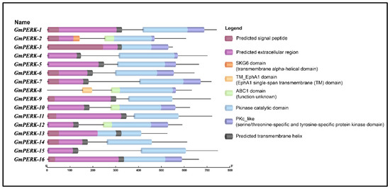 Domain structure analysis of PERK proteins in G. max shows that these proteins have the common Pkinase domain and most of them include signal peptides, extracellular regions, and single-transmembrane domains.