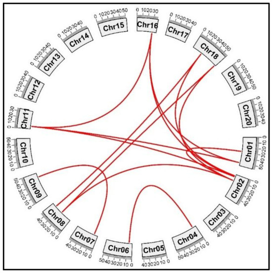 The evolutionary duplication events of GmPERK genes on different chromosomes in G. max. GmPERK-1 and GmPERK-2 are located on chromosome 1; GmPERK-3 and GmPERK-4 on chromosome 2; GmPERK-6 on chromosome 4; GmPERK-7 on chromosome 6; GmPERK-8 on chromosome 7, GmPERK-9 and GmPERK-10 on chromosome 8; GmPERK-11 and GmPERK-12 on chromosomes 9 and 11 respectively; GmPERK-14 on chromosome 16; GmPERK-15 and GmPERK-16 on chromosome 18. Red lines connect the paralogous gene pairs.