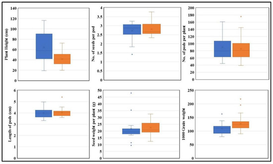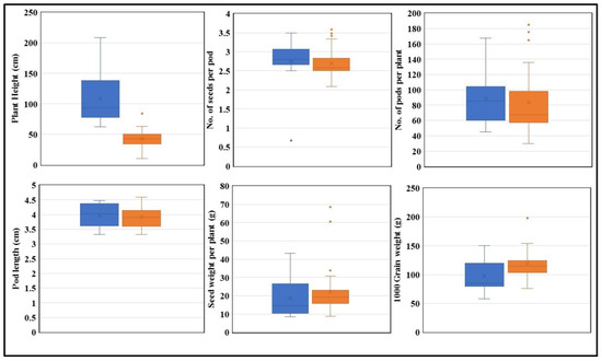 The performance of the “T” and “C” alleles under optimal condition. “T” is represented in blue, and “C” is represented in orange. Plant height, no. of seeds per pod, no. of pods per plant, pod length, seed weight per plant, and 1000 grain weight are plotted (n = 3). (p < 0.05).