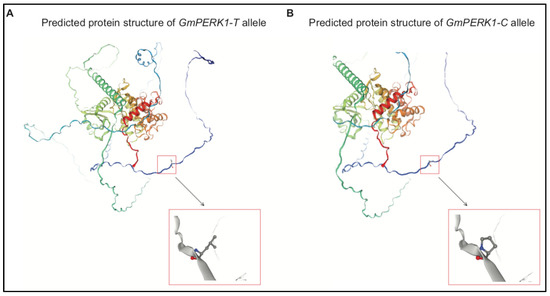 “SWISS-MODEL” predicted protein tertiary structure of GmPERK1-T allele (A) and GmPERK1-C allele (B).