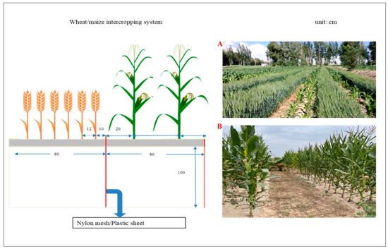 Intercropping, which has been practiced in China for millennia, has the potential to achieve higher yields than monocropping, mainly due to increased efficiency in the utilization of water, light, nutrients, and other resources [1,2]. The implementation of rational intercropping patterns can facilitate the formation of a stratified canopy structure for crops, thereby enhancing the interception of light energy [3]. It also enhances ventilation and light transmission conditions, thereby maximizing the advantages of border rows [4]. In addition, root interpenetration has been shown to improve the competitive environment below ground in intercropping systems, which can significantly increase the productivity of land per unit area [5]. Wheat (Triticum aestivum L.)/maize (Zea mays L.) intercropping, introduced in the 1970s in the oasis irrigation areas of northwest China, is still a common cropping pattern and has made a major contribution to poverty alleviation and food security [6]. Moreover, planting a combination of C3 and C4 crops can maximize area utilization and provide complementary benefits.