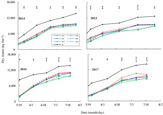 Dynamics of above-ground dry matter accumulation of sole- and intercropped wheat at jointing, earing, flowering, and filling maturity stages in 2014, 2015, 2016, and 2017. CI: Complete below-ground interaction. PI: Partial below-ground interaction. NI: No below-ground interaction. “1” and “2”: Low- and high-density maize planting, respectively. “1” and “2”: Low- and high-density maize planting, respectively. W: Sole wheat. The vertical bars represent the least significant difference (LSD) at p < 0.05 among treatments within a measurement date.