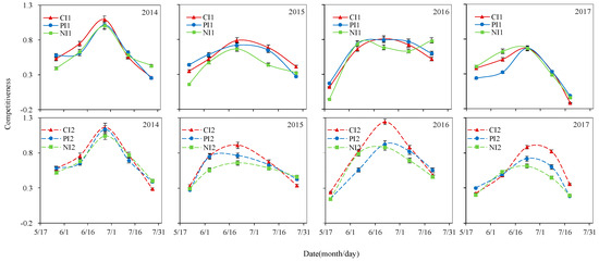 The dynamic interaction aggressivity of the wheat/maize intercropping system at the wheat jointing, earing, flowering, and filling maturity stages (corresponding maize V1, V3, V6, V12, and VT stages) in 2014, 2015, 2016, and 2017. CI: Complete below-ground interaction. PI: Partial below-ground interaction. NI: No below-ground interaction. “1” and “2”: Low- and high-density maize planting, respectively. The error bars indicate the standard errors of the means (n = 3).