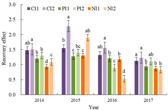 Recovery effect of maize in an intercropping system after wheat harvest in 2014, 2015, 2016, and 2017. CI: Complete below-ground interaction. PI: Partial below-ground interaction. NI: No below-ground interaction. “1” and “2”: Low- and high-density maize planting, respectively. The error bars indicate the standard errors of the means (n = 3). The lowercase letters above the bars indicate significant differences (p < 0.05).