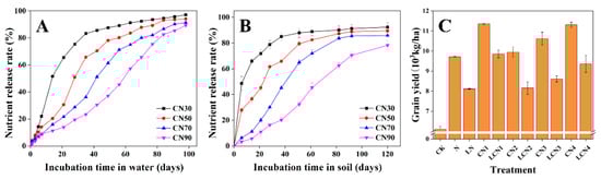 Nutrient release characteristics of different nitrogen fertilizers and their effects on rice yield. N release curves of CN30, CN50, CN70 and CN90 in 25 °C water (A) and field soil (B); (C) Grain yield of rice under different fertilization treatments. Notes: CK (without N fertilizer), N (N300 × Urea), LN (N240 × Urea), CN1 (N300 × CN30), LCN1 (N240 × CN30), CN2 (N300 × CN50), LCN2 (N240 × CN50), CN3 (N300 × CN70), LCN3 (N240 × CN70), CN4 (N300 × CN90), LCN4 (N240 × CN90).