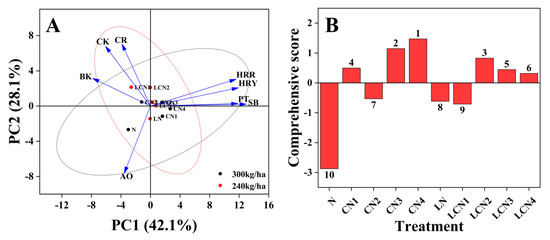 (A) Principal component analysis (PCA) based on quality indicators; (B) Comprehensive score of different fertilization treatments based on PCA. Notes: CK (without N fertilizer), N (N300 × Urea), LN (N240 × Urea), CN1 (N300 × CN30), LCN1 (N240 × CN30), CN2 (N300 × CN50), LCN2 (N240 × CN50), CN3 (N300 × CN70), LCN3 (N240 × CN70), CN4 (N300 × CN90), LCN4 (N240 × CN90).