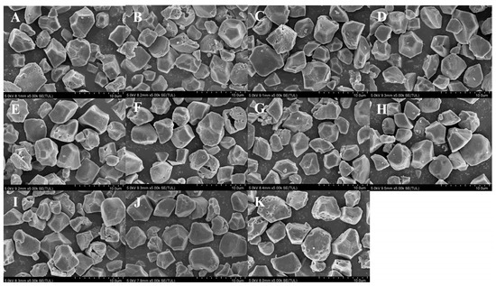 SEM images of rice starch grains with different fertilization treatments. (A–K), CK, N, LN, CN1, LCN1, CN2, LCN2, CN3, LCN3, CN4, LCN4 treatment of cultivar Shengxiang 66, respectively.