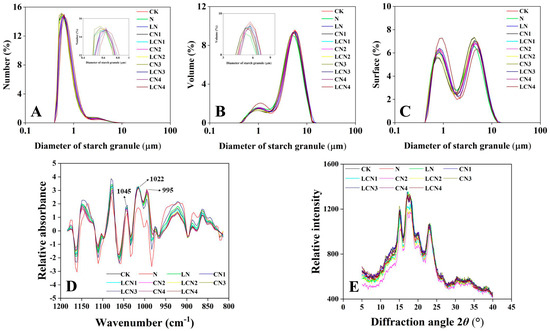 Effect of different nitrogen fertilizer on the structure of rice starch. Number (A), volume (B) and area (C) distribution of starch granules; ATR-FTIR spectra of rice starch (D) and X-ray diffraction patterns of rice starch (E). Notes: CK (without N fertilizer), N (N300 × Urea), LN (N240 × Urea), CN1 (N300 × CN30), LCN1 (N240 × CN30), CN2 (N300 × CN50), LCN2 (N240 × CN50), CN3 (N300 × CN70), LCN3 (N240 × CN70), CN4 (N300 × CN90), LCN4 (N240 × CN90).