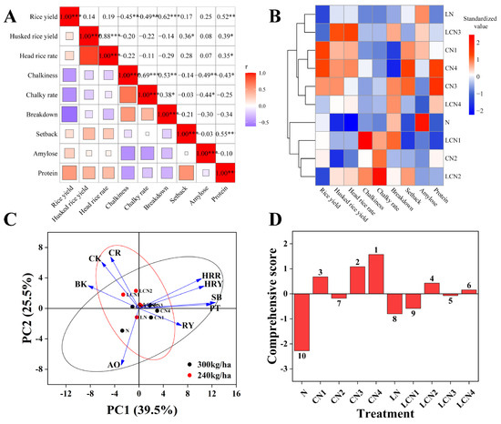 Comprehensive evaluation of rice yield and quality. (A) The Pearson correlation between yield and quality indicators; (B) The clustering analysis of different fertilization treatments; (C) Principal component analysis (PCA) based on yield and quality indicators; (D) Comprehensive score of different fertilization treatments based on PCA. Notes: N (N300 × Urea), LN (N240 × Urea), CN1 (N300 × CN30), LCN1 (N240 × CN30), CN2 (N300 × CN50), LCN2 (N240 × CN50), CN3 (N300 × CN70), LCN3 (N240 × CN70), CN4 (N300 × CN90), LCN4 (N240 × CN90). Rice yield (RY); Husked rice yield (HRY); Head rice rate (HRR); Chalkiness (CK); Chalky rate (CR); Breakdown (BK); Setback (SB); Amylose (AO); Protein (PT); (*: p < 0.05; **: p < 0.01; ***: p < 0.001).