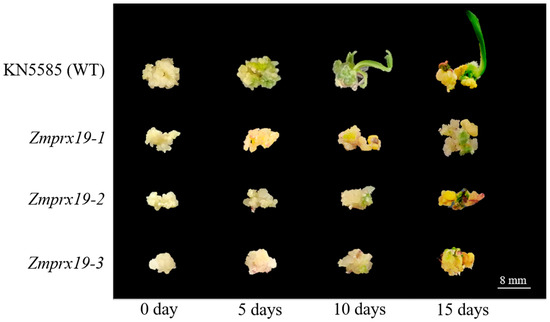 On this basis, the wild-type inbred line KN5585 and its three gene-edited mutants Zmprx19-1, Zmprx19-2 and Zmprx19-3 were used as plant materials in this study. The germplasms were planted in October 2022 in the greenhouse of Jilin Agricultural Science and Technology University. A randomized complete block design was applied with four replications. Three rows of each material were planted in each replicate, with a row length of 4.5 m, row spacing of 0.65 m, and plant spacing of 0.25 m. Self-pollination was carried out when the maize plants reached the silking stage. Ten to twelve days after pollination, eight ears were randomly selected from each replicate of the genotypes. One hundred immature embryos approximately 1.5 mm in length were removed from each ear. In total, 800 immature embryos were collected from each replicate of each material, and ultimately, 3200 explants from the four replicates for each genotype were used for tissue culture. Regeneration of the plant explants was carried out through the organogenesis pathway. First, immature maize embryos were induced in the dark for 4 weeks. The ECs obtained from the induction culture were subsequently incubated in the light for another 4 weeks to regenerate green plantlets. Phenotypic data for three traits, embryogenic callus induction rate (EIR), green callus rate (GCR) and plantlet regeneration rate (PRR), were collected, and the mean values of each trait were calculated for each plot. Finally, descriptive statistical analysis and analysis of variance were performed on the four replicate datasets using SPSS 24.0 (IBM Corp., Armonk, NY, USA). The procedures, conditions for maize tissue culture and methods for trait identification were described in our previous study [18].