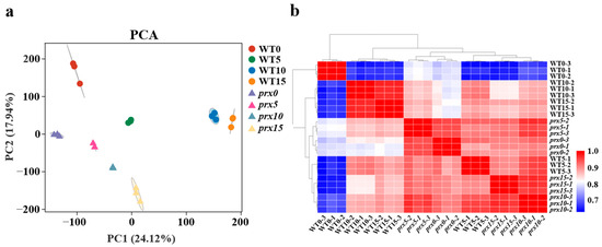 Gene expression levels for all the samples were calculated using the fragments per kilobase of transcript per million mapped reads (FPKM) method [21] in StringTie [20]. The obtained gene expression matrices were subjected to sample correlation and principal component analysis (PCA), which were performed using the cor and prcomp functions in R 4.2.1 (www.r-project.org, accessed on 5 January 2024), respectively. Differentially expressed genes (DEGs) were identified between the sample pairs (WT0 vs. prx0, WT5 vs. prx5, WT10 vs. prx10, and WT15 vs. prx15) using DESeq2 [22] with the screening parameters set as a fold change (FC) ≥ 2 and a false discovery rate (FDR) ≤ 0.01.