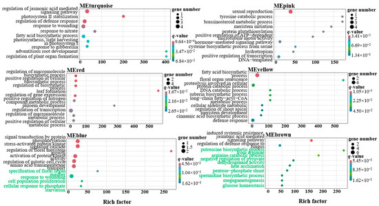 To identify the specific functions of the nine modules, we performed GO enrichment analysis on each of the modules. The results showed that all the gene sets were significantly enriched (q < 0.05) in both biological process and molecular function first-level classifications. However, only some modules (MEbrown, MEblue, MEturquoise and MEpink) were enriched in cellular components (Table S5). According to the biological process classification, MEturquoise was significantly enriched in GO terms such as regulation of plant organ formation, adventitious root development and photosynthesis, and light harvesting in photosystem I (Figure 7 and Table S5), suggesting that the genes in this module may be directly involved in key steps of plant organogenesis. In addition, the hormone signaling terms enriched in this module, such as regulation of the jasmonic-acid-mediated signaling pathway and response to gibberellin, have also been shown to be closely related to somatic regeneration [30]. MEpink was significantly enriched in terms such as meristem initiation and hormone-mediated signaling pathways (Figure 7 and Table S5), suggesting that the genes in this module may function upstream of MEturquoise. Moreover, cell-fate-related terms such as regulation of the mitotic cell cycle, regulation of shoot apical meristem development, and leaf formation were also identified in the MEblue, MEyellow, and MEred modules (Figure 7 and Table S5). Finally, in the molecular function and cellular component classifications, GO terms such as protein serine/threonine kinase activity, calmodulin binding and photosystem II were significantly enriched (Table S5), suggesting that these modules may play a role in pathways such as photosynthesis and signal transduction.