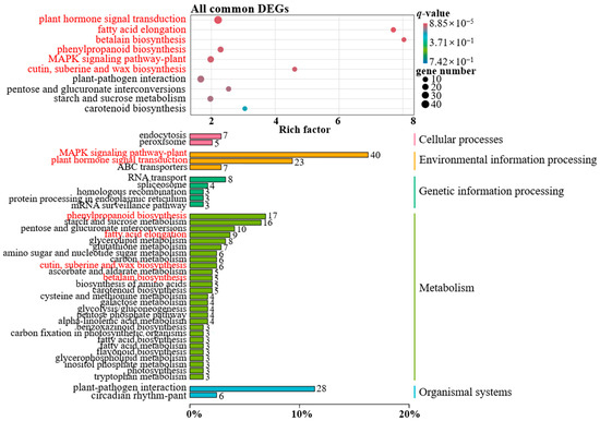 Air bubble graph and classification graph showing Kyoto Encyclopedia of Genes and Genomes (KEGG) pathways enriched in all the common DEGs. The red font represents significantly enriched terms (q < 0.05).