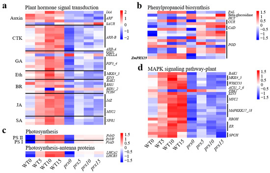 Relative expression patterns of the common DEGs involved in somatic regeneration. The data were mapped by log2(FC), and the data were row standardized. (a) Expression patterns of the genes related to plant hormone biosynthesis. (b) Expression patterns of the genes related to phenylpropanoid biosynthesis. (c) Expression patterns of the genes related to photosynthesis mechanisms. (d) Expression patterns of the genes related to the plant MAPK signaling pathway.