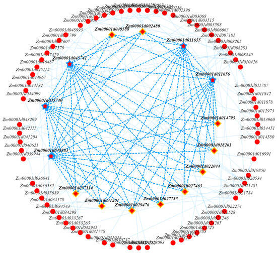 Mitogen-activated protein kinases (MAPK) are a group of serine-threonine protein kinases that can be activated by various extracellular stimuli. MAPK activation is the final step in the intracellular phosphorylation cascade and has multiple effects on cell proliferation, stress, differentiation and apoptosis [36]. A total of 23 DEGs were significantly enriched in the MAPK signaling pathway-plant in this study (Figure 9d and Table S4). These genes included five MAPKKK17_18 genes and two MKK4_5 genes, which were downregulated up to 37.4-fold in the mutant (Table S4). Zhang et al. [37] reported that mutations in Arabidopsis MKK4_5 cause defective embryogenesis under maternal control. The MKK4_5 genes mined in this study belong to the same family as previously reported genes. Moreover, the MAPKKK17_18 genes are located upstream of MKK in the cascade reaction. Strong inhibition of the transcriptional activity of these DEGs may also lead to the loss of embryogenesis in plant somatic cells [38]. In addition, all five MAPKKK17_18 genes were identified as hub genes in the PPI network analysis (Figure 10), which further supports the above analysis. Overall, we speculate that the five MAPKKK17_18 genes may be the key genes controlling plant somatic regeneration. The genes Zm00001d018261, Zm00001d027463 and Zm00001d037114 are three radiation nodes associated with the hub nodes (Figure 10). These genes are significantly enriched in the MAPK pathway, which encodes the LRR receptor-like serine/threonine-protein kinase ERECTA (ER) located at the cell membrane (Figure S6). These products play important roles in organ morphogenesis, such as the meristematic organization of plant stem tips and the development of reproductive organs [39]. Finally, the three MYC2 genes involved in plant hormone signal transduction were also detected in the MAPK pathway (Figure 9 and Table S4). MYC2 not only regulates the crosstalk between JA signaling and other hormone signals but is also involved in the interaction between JA signaling and light and the biological clock, which ultimately functions in plant development, adventitious root formation, and flowering time [40].