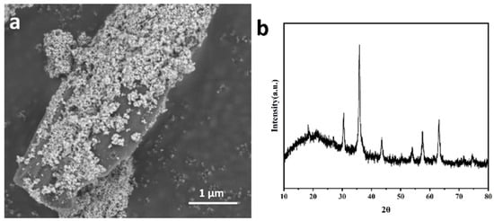 The surface morphology of the nZVI@BC was examined using SEM (Figure 1b). The nZVI@BC composite showed a significantly rougher surface with numerous white particles attached to the biochar substrate [22]. These particles are attributed to the nZVI and iron oxide phases identified in the XRD analysis. Some free particles were observed to aggregate, likely due to the combined effects of magnetic forces and surface tension [23]. This morphology is consistent with typical descriptions of nZVI reported in previous studies.