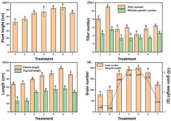 (a) Rice plant height under different treatments. (b) Tiller number and effective panicle number under different treatments. (c) Panicle length and flag leaf length under different treatments. (d) Grain number and 100-grain weight under different treatments. Different lowercase letters indicate significant differences among treatments (p < 0.05).