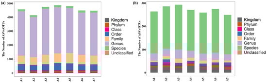 The differences in taxonomic diversity between bacteria and fungi across treatments underscore the complex and often contrasting responses of these two major groups of soil microorganisms to soil amendments. These results emphasize the importance of considering both bacterial and fungal communities when assessing the impacts of soil amendments on soil microbial ecology. Figure 3 illustrates the number of bacterial and fungal OTUs for each treatment. For bacteria (Figure 3a), treatment A4 showed the highest number of OTUs, followed by a decreasing trend as the amount of nZVI@BC increased in subsequent treatments. This suggests that there may be an optimal concentration of nZVI@BC for promoting bacterial diversity, beyond which the diversity begins to decline. The initial increase in bacterial OTUs with the addition of nZVI@BC could be due to the creation of new microhabitats on the biochar surface and the potential slow release of nutrients or electron donors from the nZVI component [45]. However, at higher concentrations, nZVI@BC might start to exert inhibitory effects on some bacterial groups [46], possibly due to changes in redox conditions or the release of inhibitory compounds.