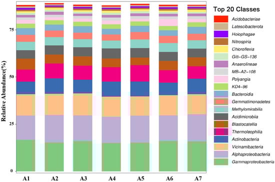Figure 4 presents the relative abundance of bacterial communities at the class level across different treatments. The top 10 most abundant bacterial classes across all treatments were Gammaproteobacteria, Alphaproteobacteria, Vicinamibacteria, Actinobacteria, Thermoleophilia, Blastocatellia, Acidimicrobilia, Methylomirabilia, Gemmatimonadetes, and Bacteroidia. These 10 classes accounted for approximately 75% of the total bacterial sequences. Treatment A2, which received only the soil conditioner, showed the highest overall abundance of these bacterial classes. This suggests that the soil conditioner had a generally positive effect on bacterial growth and proliferation, possibly due to improved soil structure and nutrient availability. However, the addition of nZVI@BC appeared to have a slight suppressive effect on overall bacterial abundance, with the effect being relatively consistent across different nZVI@BC concentrations.