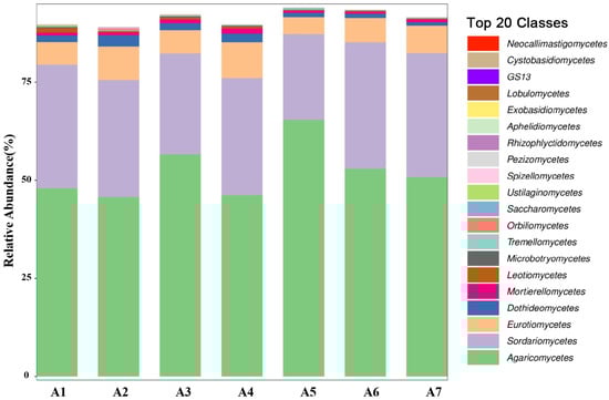 Figure 5 illustrates the relative abundance of fungal communities at the class level across different treatments. The top 10 most abundant fungal classes were Agaricomycetes, Sordariomycetes, Eurotiomycetes, Dothideomycetes, Leotiomycetes, Microbotryomycetes, Tremellomycetes, Orbiliomycetes, and Saccharomycetes. These classes accounted for approximately 90% of the total fungal sequences, indicating a more concentrated dominance compared to the bacterial communities.