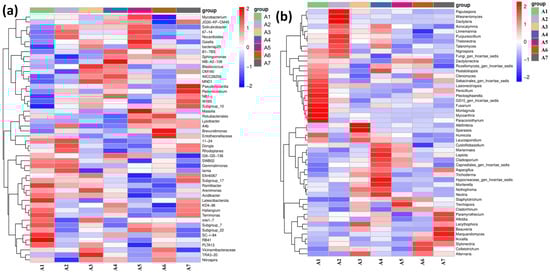 Figure 6 presents heat maps of the species composition for (a) bacteria and (b) fungi at the genus level based on the hierarchical clustering of community relative abundance. For bacteria, the control treatment (A1) showed high expression of genera such as RB41, Latescibacterota, and SC-I-84. In contrast, treatments with soil amendments (A2–A7) were characterized by high abundance of genera, including 11–24, TRA3-20, Blastococcus, MB-A2-108, Massilia, Brevundimonas, Entotheonellaceae, Pseudonocardia, and Pedomicrobium. This shift in bacterial community composition suggests that the soil amendments created conditions that favored different bacterial groups. The genera that became abundant in the amended treatments are known to include many species with beneficial traits for plant growth and soil health. For instance, Massilia includes species known for their plant-growth-promoting abilities, while Pseudonocardia contains members capable of degrading complex organic compounds.
