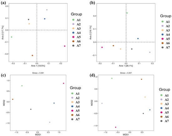 The NMDS analysis (Figure 7c,d) provided complementary insights into community composition differences. The stress values for bacterial and fungal NMDS were 0.091 and 0.207, respectively, indicating a good representation of the multidimensional data in two-dimensional space, particularly for bacteria.
