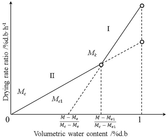 - The intrinsic theoretical drying rate ratio of the material itself is a single-valued function of the material’s water activity, with its mathematical expression as follows: . Under isothermal conditions, water activity is a single-valued function of water content, where water content can be expressed as a mass ratio.