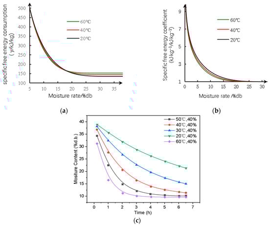 At this stage, the change in free energy related to moisture in the material can be described as a single-valued function of temperature, and the moisture evaporation process is equivalent to free surface evaporation. Therefore, it can be inferred that the drying process of the material with high moisture content can be simplified as constant-rate drying. The curves in Figure 4a intersect at varying temperatures, suggesting that the moisture evaporation rate in the rice hull was higher than that of the rice grain during the initial drying stage. As the temperature increased, the moisture content in the rice hull decreased, leading to a corresponding increase in the consumption of free energy by the rice hull.