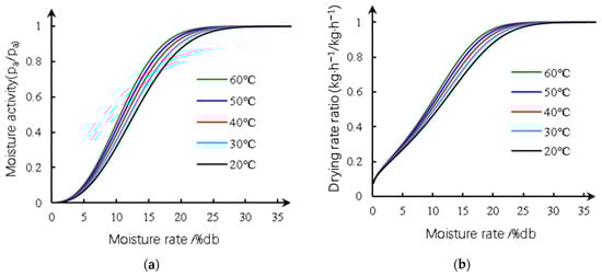 Figure 4a illustrates the relationship between the free energy consumption ratio of rice grain during moisture evaporation and moisture content at various temperature conditions, as determined by Equations (4), (6), (9) and (12). Figure 4b illustrates the variation in the free energy coefficient with moisture content. Figure 5a illustrates the relationship between moisture content and water activity, while Figure 5b illustrates the theoretical drying rate ratio as determined from the analysis.