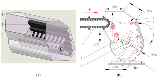 Structure and working principle diagram of the crushing device. (a) 3D model of the crushing device: 1. rotor; 2. lining plate; and 3. external wall. (b) Working principle and structural parameter diagram of the crushing device: 1. conveying device; 2. hammer; 3. crushing shaft; 4. external wall; 5. lining plate; and 6. spreading device.
