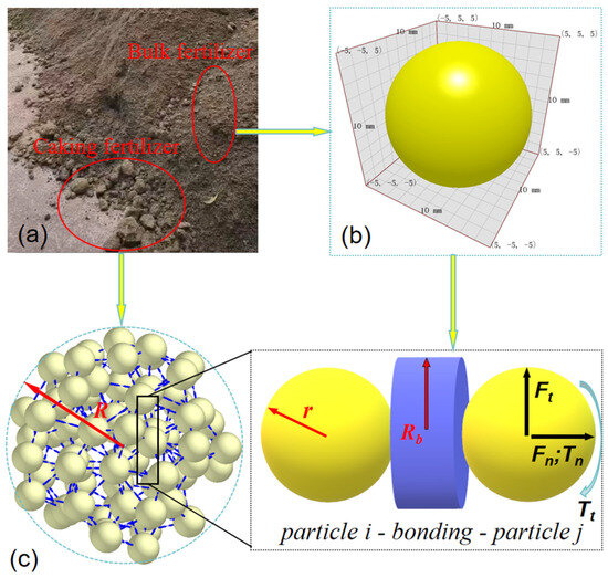 The spreader designed in this study is mainly used for the spreading of organic fertilizer with a certain moisture content and a certain degree of caking. In other words, the organic fertilizer is mixed, consisting of bulk and caked fertilizer, as shown in Figure 5a. In order to accurately represent the interactive relationship between the granular organic fertilizers, an organic fertilizer particle group model built based on the combination of the Hertz–Mindlin with bonding (HMB) and Hertz–Mindlin with JKR (JKR) models was used. Through the observation of organic fertilizer, it is evident that the shapes and sizes of organic fertilizer granules vary significantly. Therefore, it is impossible to create a particle group model in simulation experiments that perfectly mirrors the actual situation. We use the long axis diameter among the three axes as its characteristic size, distinguishing between bulk and caked organic fertilizers based on whether the long axis diameter exceeds 10 mm. From the piled organic fertilizer materials, a random sample of 5 kg of organic fertilizer was selected. Upon measurement and statistical analysis, the average long axis diameter of the caked organic fertilizer in the sample was found to be 80 mm. In order to reduce the computational complexity of the numerical simulation and simplify the modelling process, the bulk organic fertilizer was modelled by a single spheric particle with a radius (r) of 5 mm, as shown in Figure 5b. The modelling of the caked organic fertilizer was based on the HMB contact model, where a number of single spherical granules served as the basic particles, which aggregated into a spherical particle cluster with a radius (R) of 40 mm through bonding, as shown in Figure 5c. Every spherical particle cluster consisted of 76 basic particles and 263 bonds, which could withstand a certain force/torque to prevent the relative movement between the granules in the tangential and normal directions.