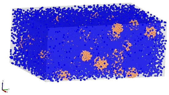 Due to the effect of moisture on granular organic fertilizer, adhesive contact occurs between the granules. In the classical Hertz contact model, only the elastic deformation is taken into account, without considering the bonding force between the contact surfaces of the granules. Hence, it is very difficult to accurately simulate the mechanical behaviours of the granular organic fertilizer. As a contact model with cohesive force, JKR considers the influence of the surface energy from the contact interface between the wet granules, using the motion law of particles based on the Hertz theory [36]. By allowing the modelling of a viscous system, this model can be used to simulate materials whose granules have been apparently bonded or aggregated together due to the electrostatic force or moisture content. In this model, the JKR surface energy has been used to represent the cohesive force between the particles [37]. In our research, the JKR model was used for the modelling of the cohesive force between the particles within the organic fertilizer particle group. The JKR surface energy was set to 0.075 J/m2 [38] for the construction of the particle group model, consisting of bulk and caked organic fertilizer granules, as shown in Figure 6.