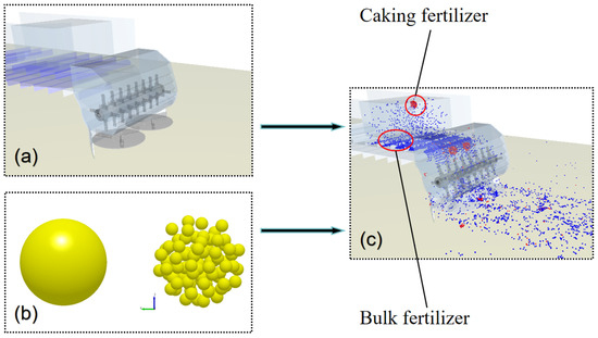 Construction process of an organic fertilizer-crushing–spreading model. (a) Three-dimensional model of an organic fertilizer-conveying–crushing–spreading device; (b) discrete element model of organic fertilizer particle; and (c) organic fertilizer-crushing–spreading model.