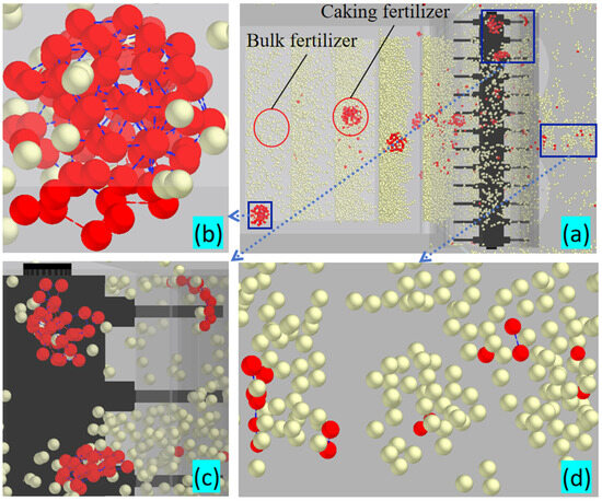 As shown in Figure 8b,c, the caked organic fertilizer appeared as relatively complete clusters of spherical particles in the conveying device, but it showed up as particle clusters with irregular shapes and a medium particle size in the crushing device. As indicated by Figure 8a–d, when the spherical particle clusters were crushed in the crushing device and spread onto the ground by the spreading device, most of the bonds were broken, and they were shattered into smaller particle clusters or basic granules.
