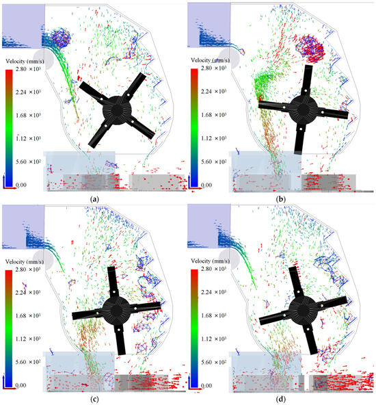 As shown in Figure 9a,b, after the organic fertilizer was conveyed to the inlet of the crushing device via the conveying device, the bulk granules would drop to the spinning disc through the gap between the hammers or between the hammer and the external wall. Then, under the centrifugal effect of the disc, they would be spread onto the field. However, if the caked organic fertilizers failed to pass through the gap, they would be accelerated to collide with the external wall or the lining plate due to the impact of the hammer. As shown in Figure 9c,d, the medium-sized clusters of particles formed under the collision effect were squeezed and rubbed by the hammer and the lining plate in the falling process, and the bonds were further broken up, resulting in the formation of clusters with a smaller particle size. Some bonds would break in the process of the particle clusters dropping at a high speed from the outlet of the crushing device, colliding with the disc.