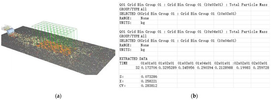 A particle plant was established in the fertilizer box, where bulk granules were generated in 10~32 s, at a rate of 2000 particles per second, and the blocky particles were generated in 10~30 s, with a total of 40 blocky particles being generated. The particle diameter was randomly distributed within 0.8~1.2 R. Every particle was generated at a random initial position, a random start angle, and in a random direction in the particle plant. According to the requirements of the standard GB/T 25401-2010 (Agricultural machinery—Manure spreaders—Environmental protection—Requirements and test methods) [41], the scraper speed of the conveying device was set to 0.05 m/s, and the operating velocity of the spreader was 0. 5 m/s. For the disc and the crushing device, the rotor speed was set to different levels according to the experimental requirement. The total simulation time was set to 32 s, and the data were stored every 0.04 s for the building of a crushing–spreading model, as shown in Figure 7c.