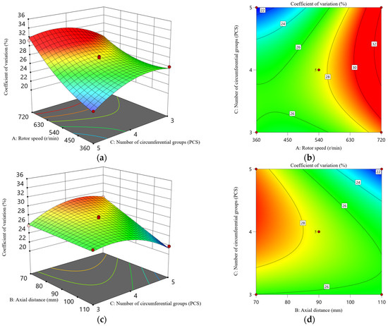 Response surface analysis of the interacting factors affecting the coefficient of variation. (a) Response surface plot of the effect of the rotor speed and the number of circumferential groups on the coefficient of variation. (b) Contour plot of the effect of the rotor speed and the number of circumferential groups on the coefficient of variation. (c) Response surface plot of the effect of the axial distance and the number of circumferential groups on the coefficient of variation. (d) Contour plot of the effect of the axial distance and the number of circumferential groups on the coefficient of variation. The change in color from blue to red indicates that the coefficient of variation changes from small to large.