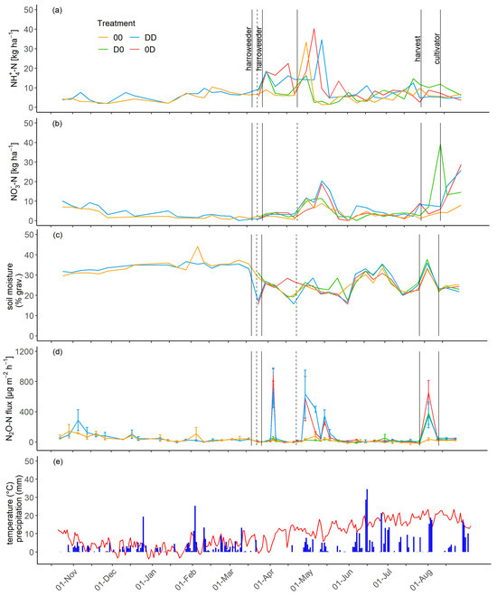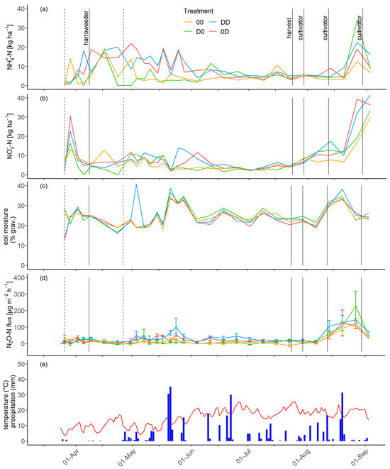 Ammonium-N (a) and nitrate-N dynamics (b) and soil moisture (c) of all four treatments related to the topsoil layer (0–15 cm) from March 2019 to September 2019. Nitrous oxide emissions (d), error bars illustrate the standard deviation) and temperature (red line) and precipitation (e) from March 2019 to September 2019. Black lines mark different agronomic actions and dashed lines mark the date of fertilization and only refer to the two fertilized treatments. (Treatments: 00 long-term unfertilized, D0 first-time unfertilized, 0D first-time fertilized, and DD long-term fertilized).