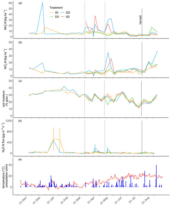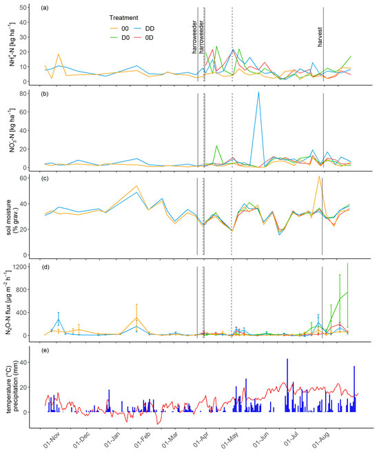 Ammonium-N (a) and nitrate-N dynamics (b) and soil moisture (c) of all four treatments related to the topsoil layer (0–15 cm) from October 2019 to September 2020. Nitrous oxide emissions (d), error bars illustrate the standard deviation) and temperature (red line) and precipitation (e) from October 2019 to September 2020. Black lines mark different agronomic actions and dashed lines mark the date of fertilization and only refer to the two fertilized treatments (DD and 0D). (Treatments: 00 long-term unfertilized, D0 first-time unfertilized, 0D first-time fertilized, and DD long-term fertilized).
