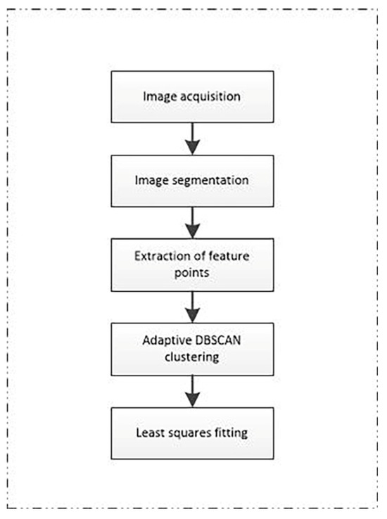 Algorithm writing is performed using PyCharm, and the subsequent research is conducted with the OpenCV computer vision library. The algorithm can be divided into five parts, ranging from image segmentation to navigation line extraction. Image segmentation is performed on the RGB image captured by the image sensor, and the green component of the soybean seedling belt is extracted to obtain a grayscale map. Feature point extraction is performed using the binarised image obtained from image segmentation. The algorithm is implemented based on the feature point extraction method proposed in this paper. The feature points are obtained and clustered using the adaptive DBSCAN clustering algorithm. Then, the centreline of the crop rows is fitted, and the navigation lines are extracted using the least squares method for the clustered set of feature points. The flowchart is shown in Figure 3.
