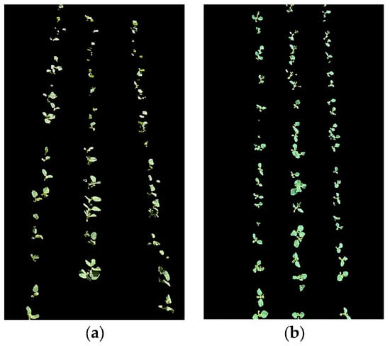 The RGB images captured are of high quality overall and meet the image segmentation requirements. The quality of the RGB images captured under sunny and cloudy weather varies. From the results of the image acquisition, the shooting angle of the image sensor did not have an impact on the quality of the acquired images and the subsequent recognition. In the field environment, the light will shine directly on the soybean seedlings, and when the light intensity is high, it will affect the image acquisition of the green soybean seedlings, resulting in the green image edges of the soybean seedlings being missing in the process of image segmentation.